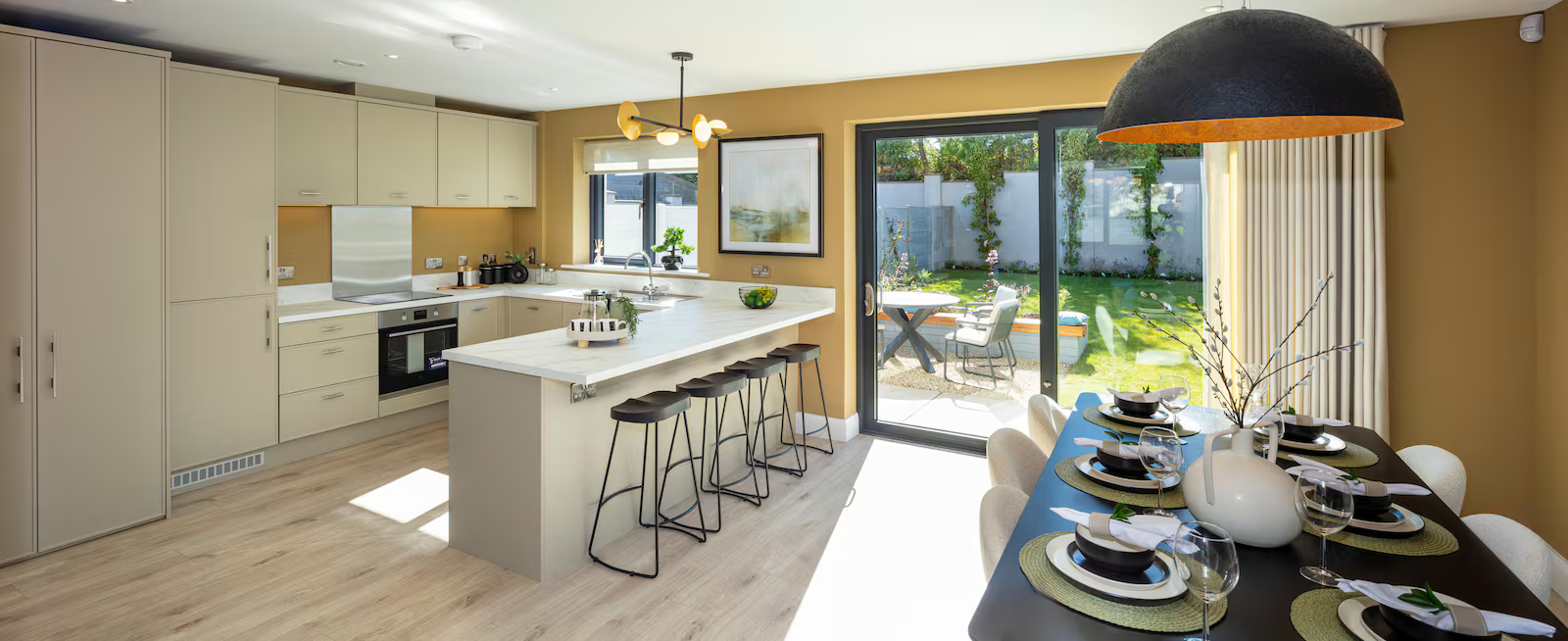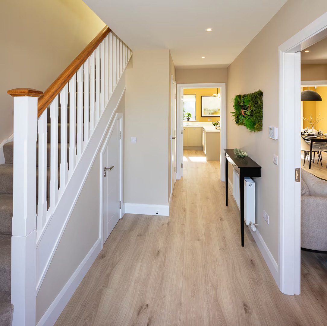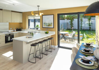 Internally, the houses are arranged with practical, well-proportioned layouts. Kitchens are supplied and fitted, with island units included in the three- and four-bedroom houses. Bathrooms are fully tiled and finished to a consistent specification, and all bedrooms include fitted wardrobes. Interiors are delivered in a neutral finish, providing flexibility for future occupants.